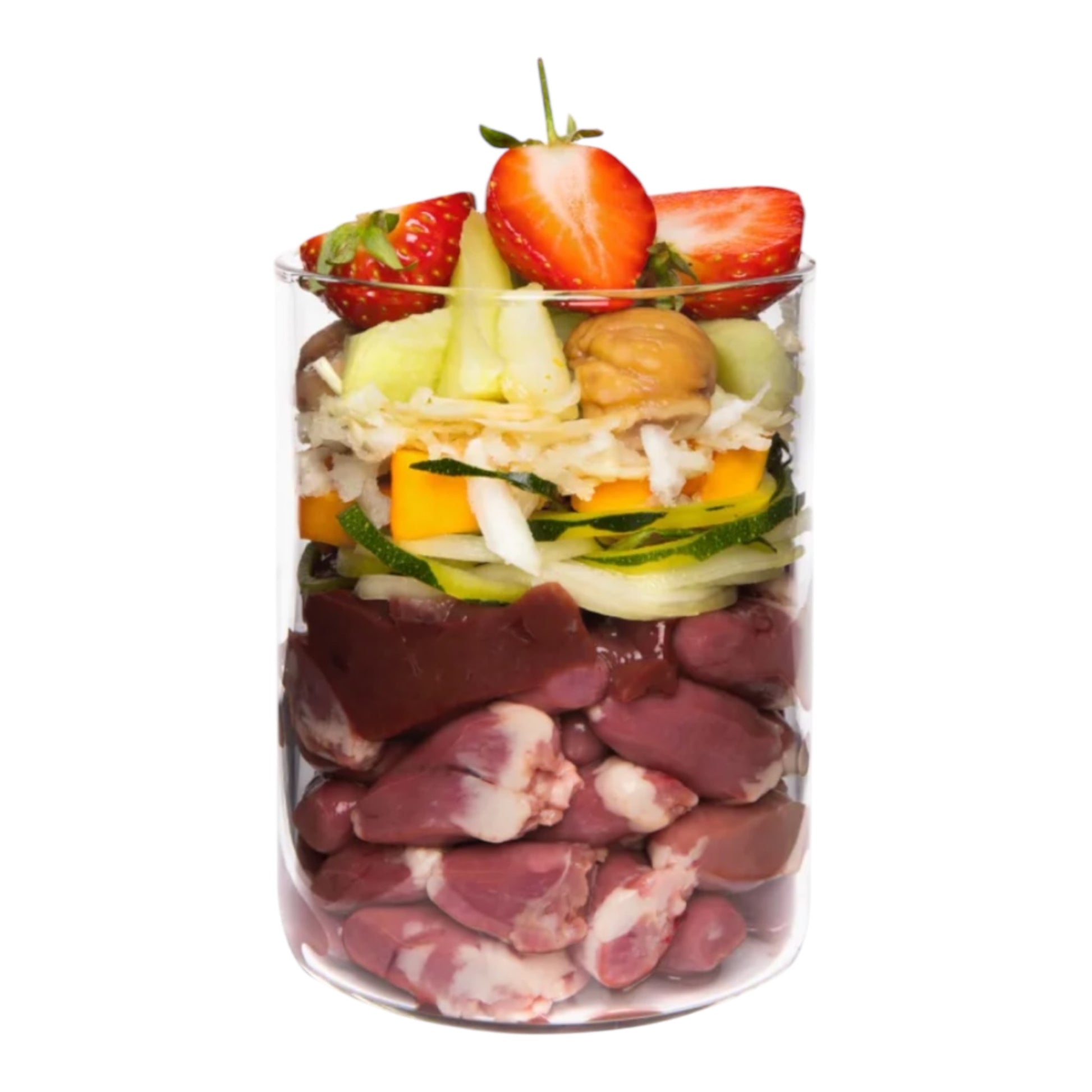 Corazón de pato (50 %), calabaza (12 %), zanahoria, higado de pato (6 %), calabacin, apio (5 %), melon, manzana, castaña (1,5%), fresa (1 %), aceite de colza, concha de ostra*, levadura de cerveza*, flor de sauco* (0,4 %), semilla de psyllium*, perifollo*, diente de león*, arcilla mineral*, perejil*, sal de los Andes, alga marina*, minerales*seco