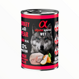 Pavo 93% (carne, hígado, corazón), pera 4%, gelatina, pulpa remolacha molida, especias y minerales.