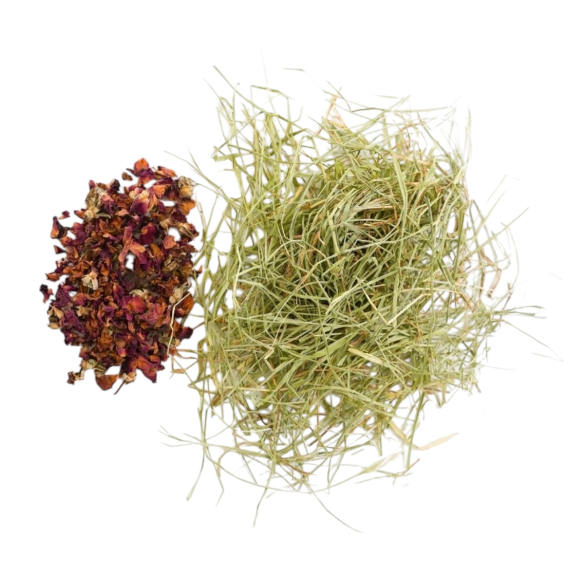 Los pétalos de rosa no solo añaden un aroma y sabor únicos, sino que también convierten este heno en una opción atractiva para las mascotas más exigentes.