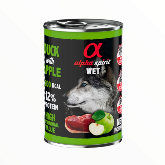 Pollo 63% (carne, hígado, corazón), pato 30% (carne, hígado, corazón), manzana verde 4%, gelatina, pulpa remolacha molida, especias y minerales.