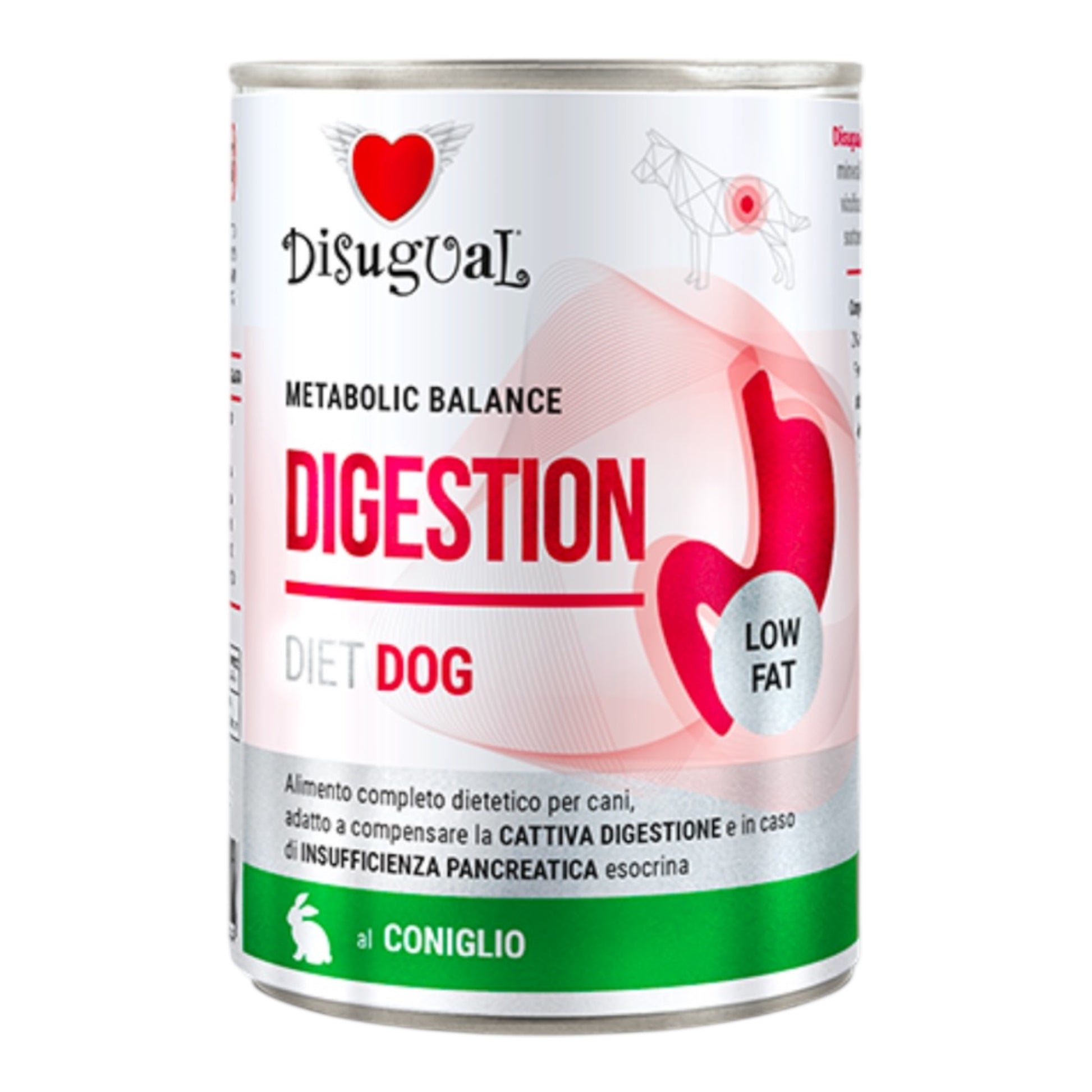 Disugual DIGESTIÓN BAJA EN GRASA es una dieta equilibrada que contiene vitaminas y minerales, suplementada con prebióticos (XOS y MOS) y polifenoles extraídos de Vitis vinifera. La dieta está formulada con proteínas hidrolizadas de alta digestibilidad y fibra prebiótica.