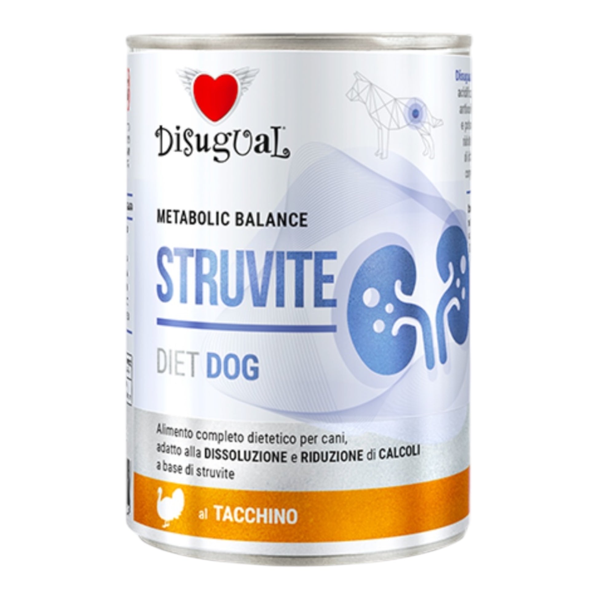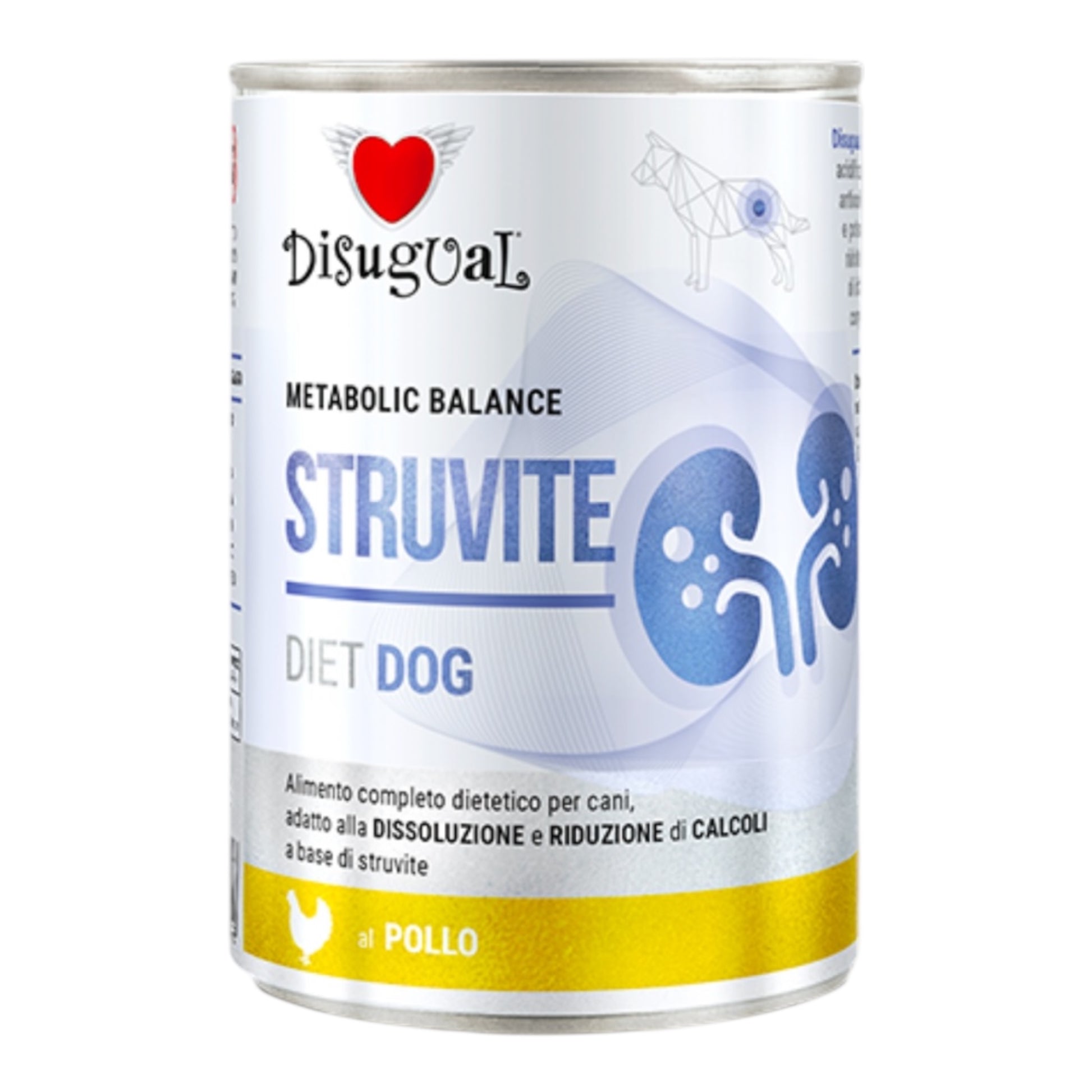 Disugual STRUVITE es un alimento completo para perros con propiedades acidificantes de la orina, suplementado con prebióticos (XOS y MOS) y polifenoles antioxidantes extraídos de Vitis vinifera. La dieta contiene magnesio y potasio reducidos para prevenir la formación de cristales de estruvita. Está formulada con una cantidad reducida de proteína cruda de alta calidad para reducir la incidencia de infecciones bacterianas del tracto urinario. Finalmente, el aceite de salmón completa la receta, asegurando la ingesta de ácidos grasos omega-3.
