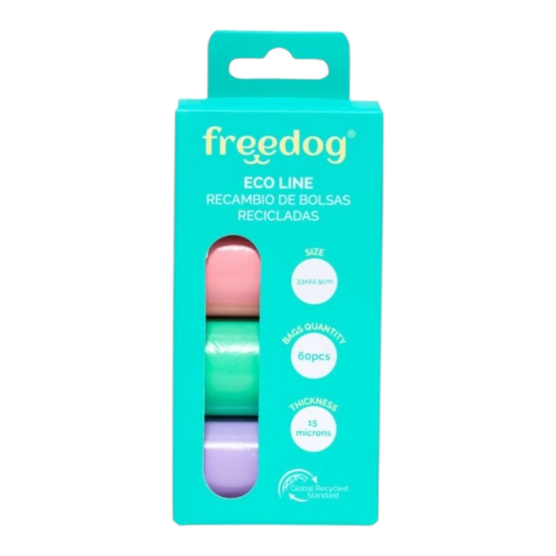 FREEDOG BOLSAS PLÁSTICO RECICLADO COLORES VARIADOS es la solución ideal para acompañar tus paseos diarios con tu animal, combinando higiene, estilo y sostenibilidad. Disponible en diferentes presentaciones, cada rollo contiene 15 bolsas.