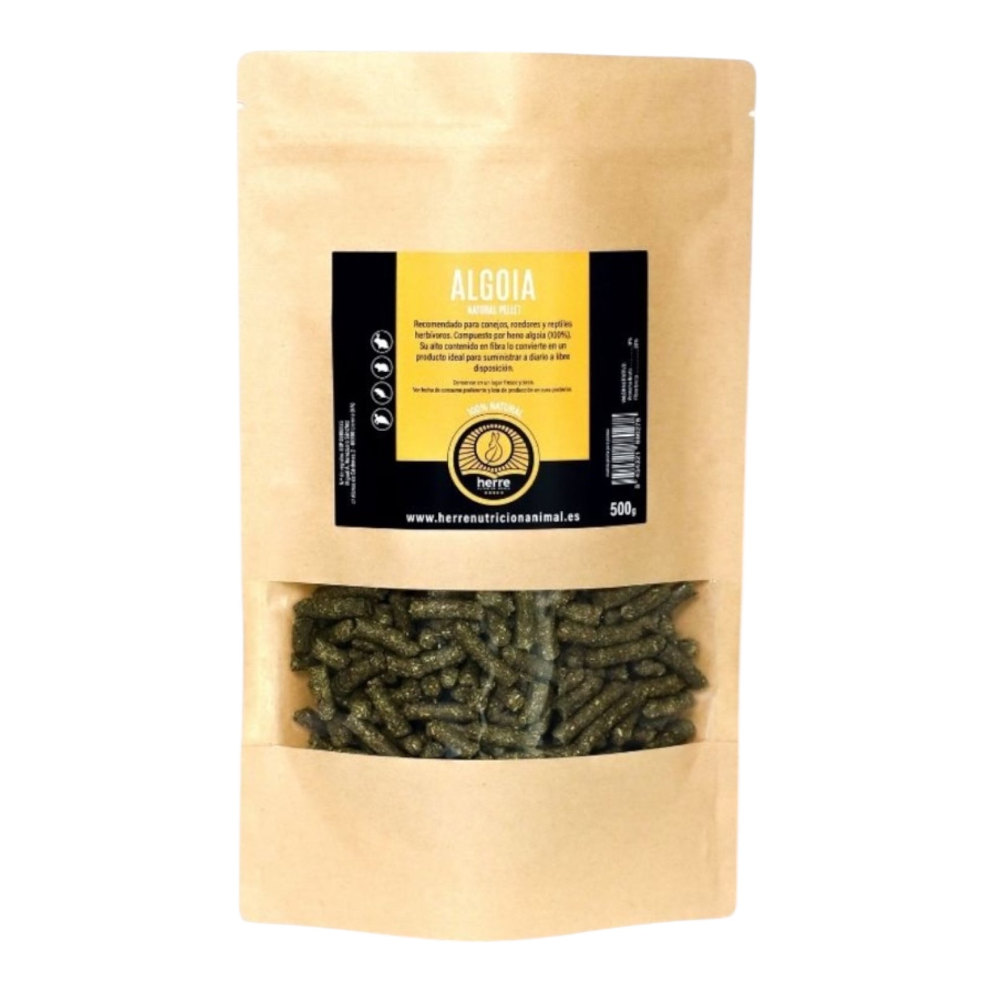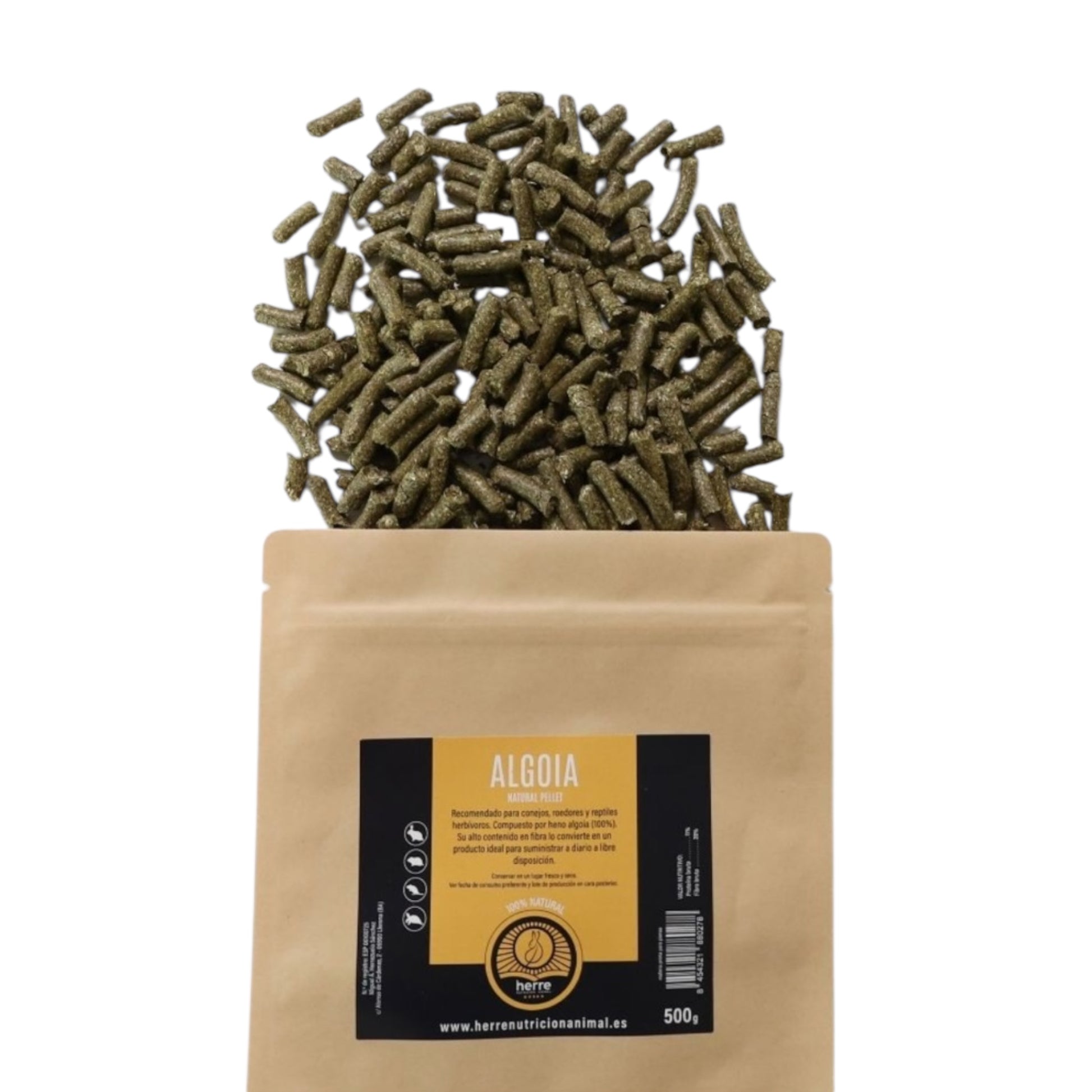 Natural Pellet de Algoia, con el mismo valor nutricional que el heno en hebras. Ideal para roedores y conejos, promueve el desgaste dental y mejora la digestión. Se presenta en formato de 500 gramos, ideal para una dieta diaria natural y completa.