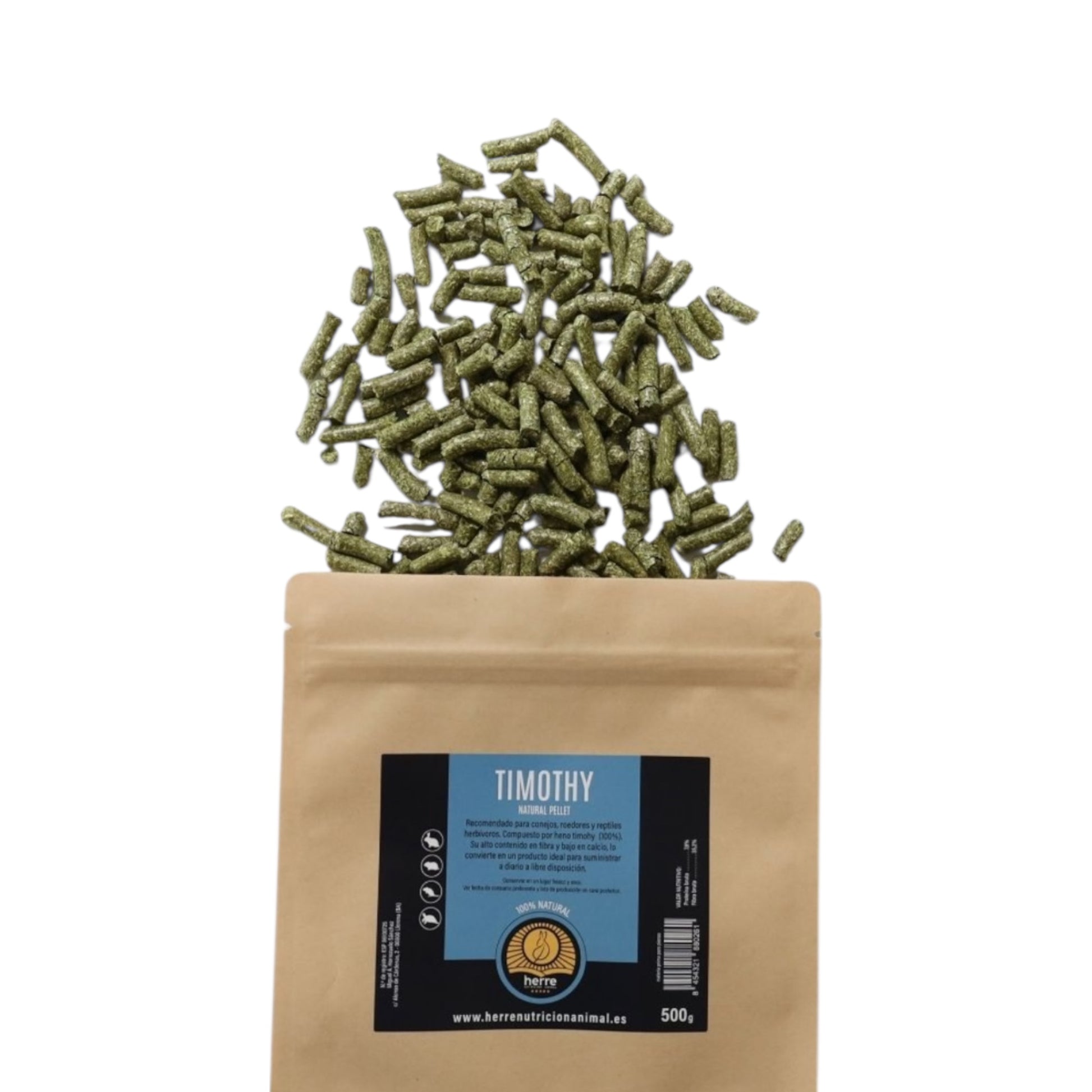 Natural Pellet de Timothy, en formato de 500 gramos. Ofrece el mismo valor nutricional que el heno en hebras y está diseñado para promover la salud dental y digestiva de roedores y conejos.
