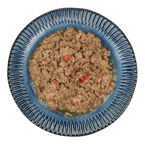 Alimento húmedo completo con un 70% de carne y vísceras. Receta sin cereales. Todos los ingredientes se cuecen suavemente al vapor en la lata para así conservarse de la mejor forma posible. La vitamina E del aceite de cártamo tiene un efecto positivo sobre la piel y el pelaje.