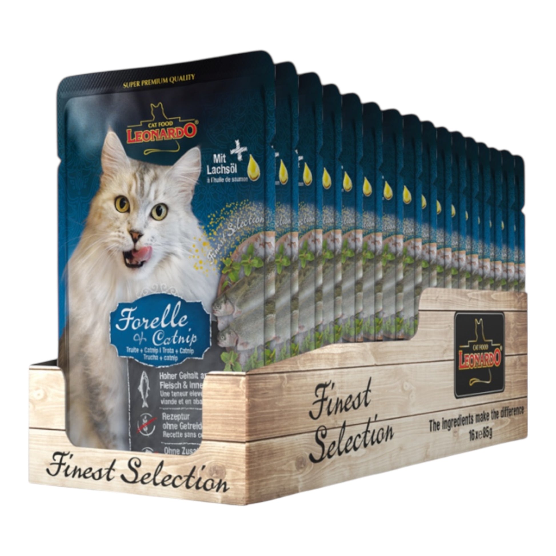 COMPOSICIÓN: trucha (30 %); corazón, hígado de pollo (30 %); caldo de trucha, pollo, ternera (28,7 %); pulmón de ternera (10 %); cáscaras de huevo, secas (0,5 %); minerales (0,5 %); aceite de salmón (0,2 %); menta de gato (0,1 %)