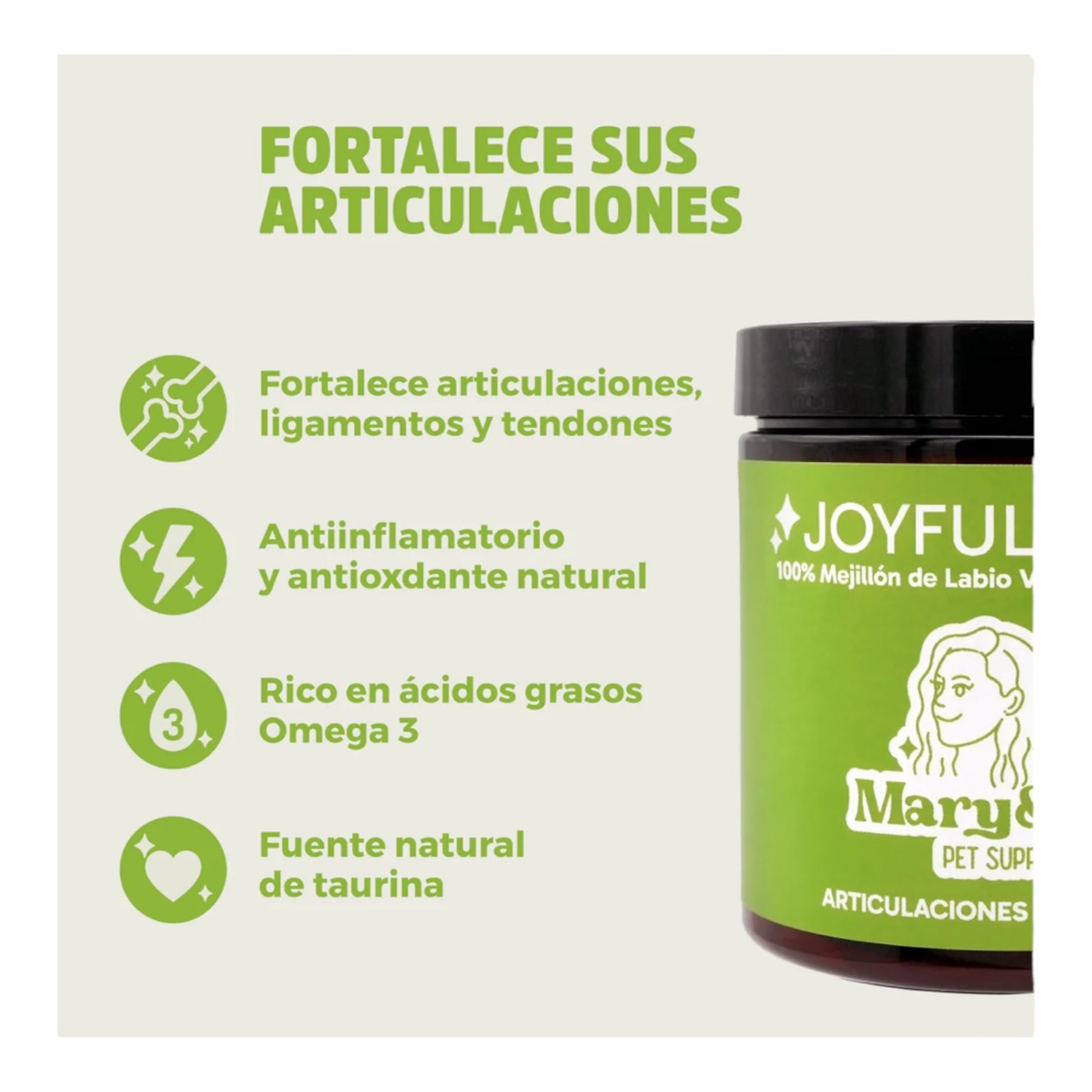 Joyful Joints está elaborado exclusivamente a base de Mejillón de Labio Verde liofilizado procedente de Nueva Zelanda. Es un condroprotector 100% natural para perros y gatos, perfecto para fortalecer articulaciones, ligamentos y tendones. El mejillón verde es fuente de taurina y contiene omega 3. Cunde mucho, ¡para más de 330 dosis! ¡Esto equivale a una duración de unos 11 meses para un perro de 11 kg!