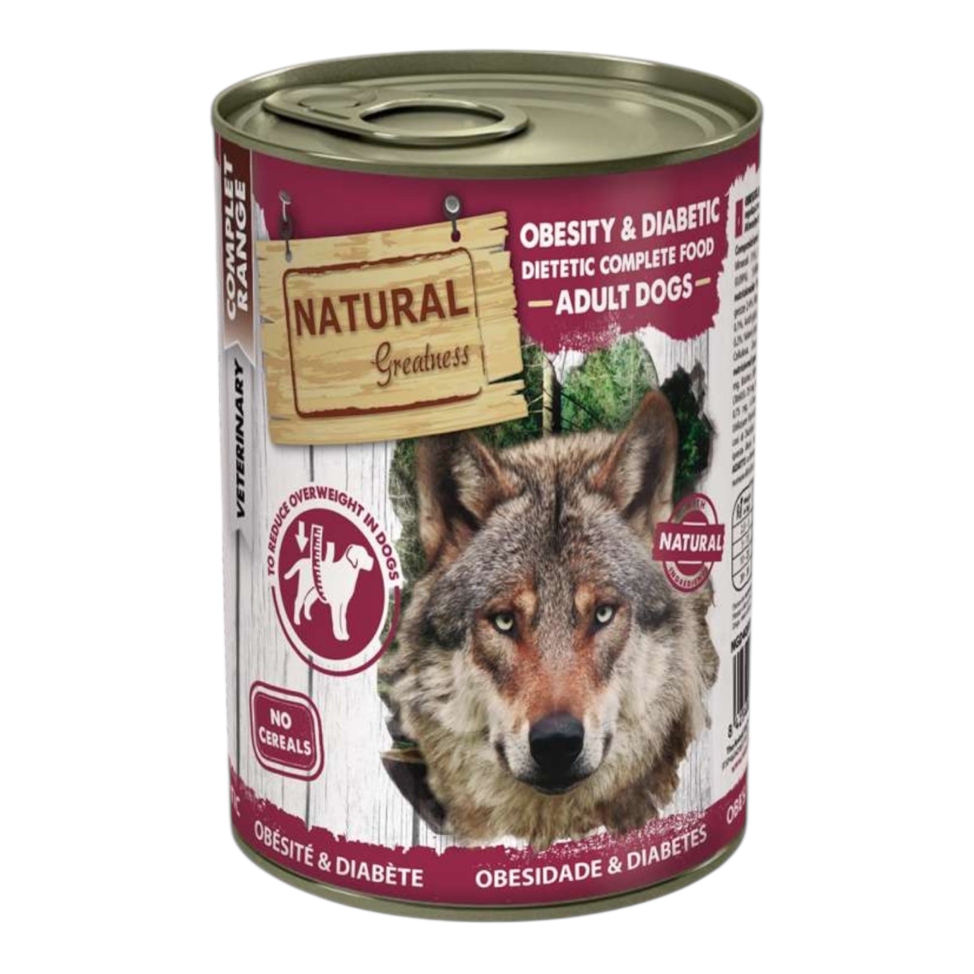 Natural Greatness OBESITY CONTROL es un alimento húmedo completo hipoalergénico y sin cereales formulado para perros júnior y perros adultos de todas las razas con sobrepeso u obesidad, con diabetes mellitus, colitis, estreñimiento o hiperlipidemia asociada al sobrepeso. Este alimento no es apto para perras gestantes o lactantes y cachorros. Este alimento puede emplearse hasta que el animal alcance su peso adecuado. Para perros con diabetes mellitus, se recomienda utilizar el alimento hasta los 6 meses. Tras este periodo y después de una evaluación, prolongar la dieta si fuera necesario.
