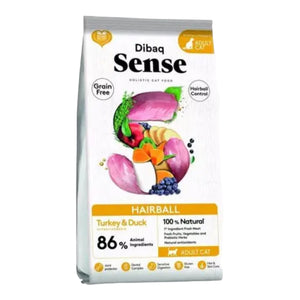 DIBAQ SENSE GRAIN FREE HAIRBALL PATO Y PAVO es un alimento completo y equilibrado para gatos adultos que ayuda a reducir la formación de bolas de pelo. Está hecho con un 50% de pato y pavo frescos, así como con una mezcla de prebióticos y extracto de yuca que ayudan a promover la digestión saludable. El alimento está libre de cereales, lo que lo hace ideal para gatos con alergias o intolerancias alimentarias.